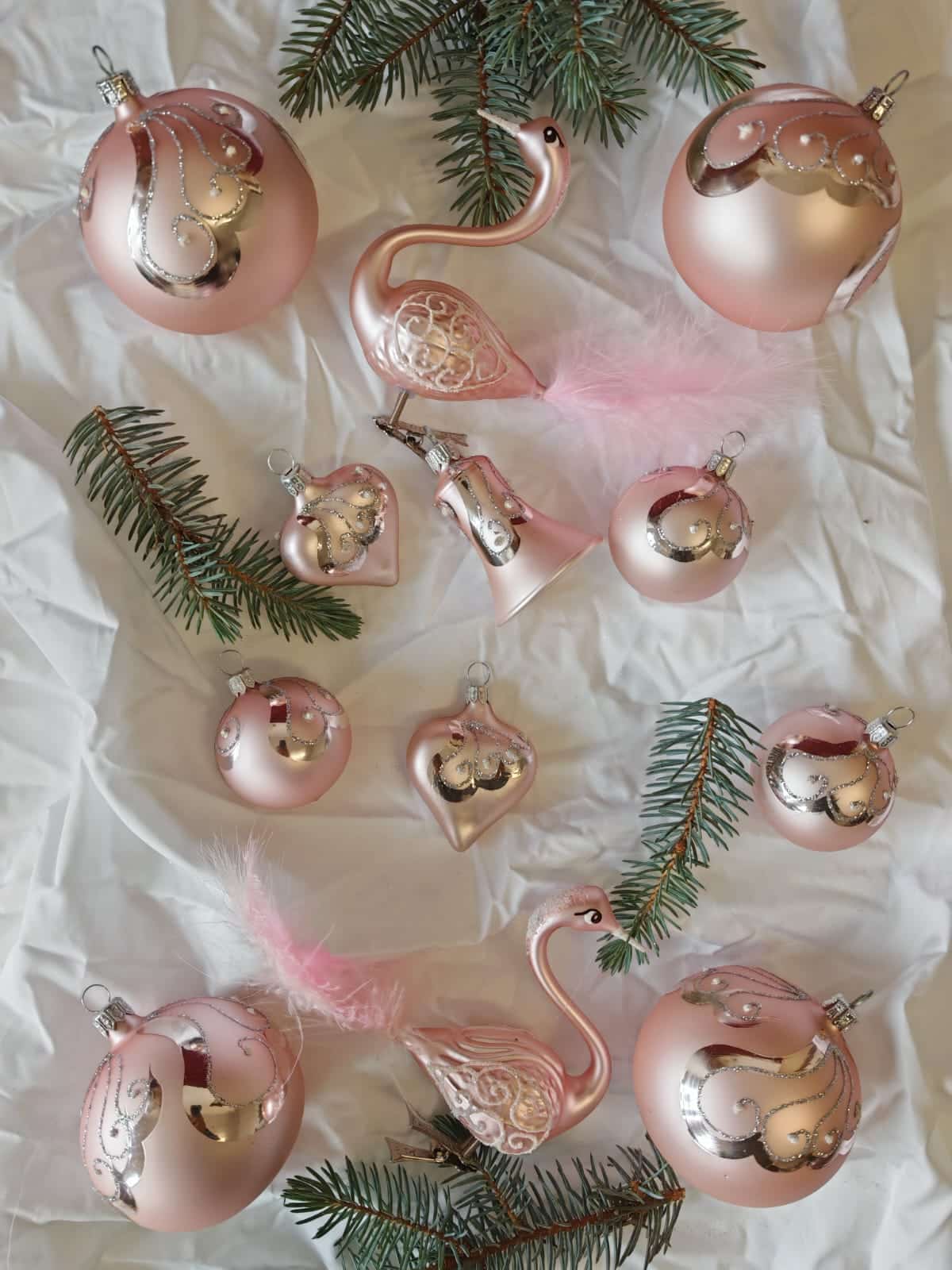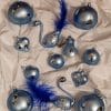 Sada se skládá z 4 koulí průměru 8 cm, 3 koulí průměru 5 cm, 2 srdíček, zvonku a 2 labutí.