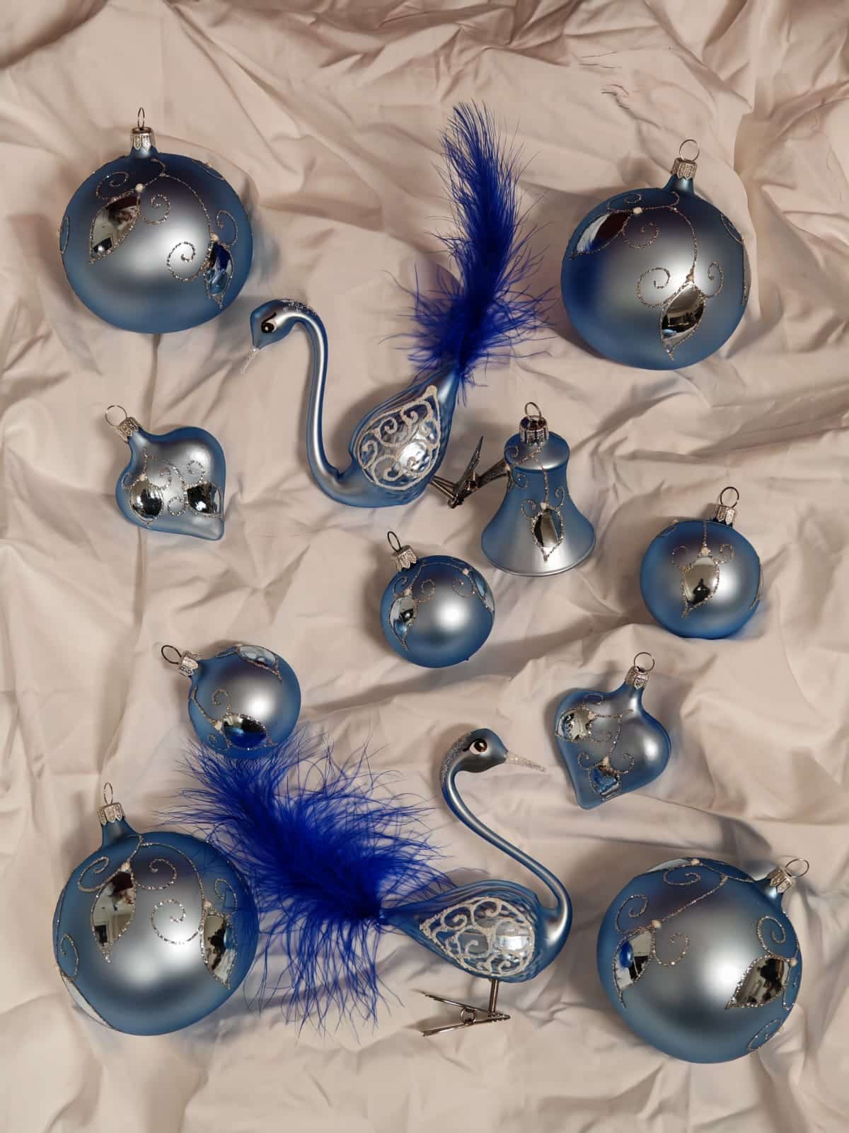 Sada se skládá z 4 koulí průměru 8 cm, 3 koulí průměru 5 cm, 2 srdíček, zvonku a 2 labutí.