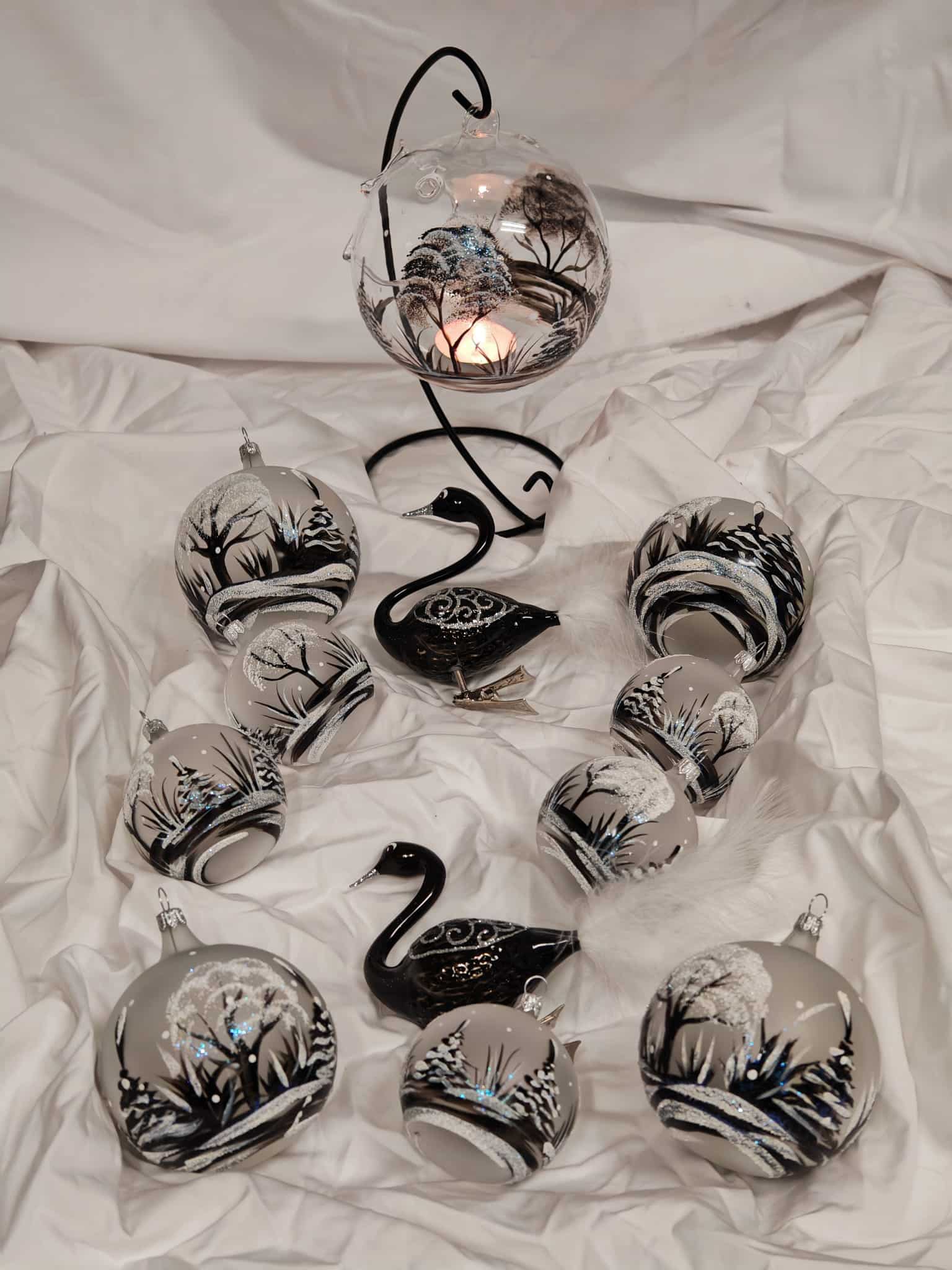 Cena za celou sadu. Sada se skládá z 4 koulí průměr 8 cm, 5 koulí průměru 6 cm, 2 labutí a s lampou průměru 12 cm.